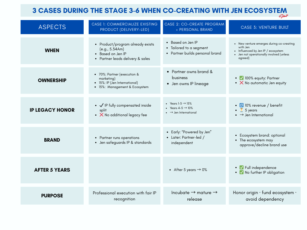 • IP honor (10%) applies only when venture is built using Jen IP / brand / network leverage