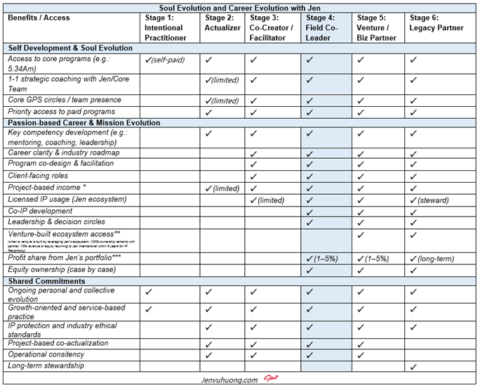 Trong 6 giai đoạn tiến hóa biến đam mê thành một phần cuộc sống và sự nghiệp, tính đến tháng 2/2026, Việt đang ở giai đoạn giao thoa stage 3 và 4, dựa trên mong muốn cá nhân của Việt, Việt cùng Jen có tiềm năng đồng hành với tâm thế giai đoạn 6 từ bây giờ.